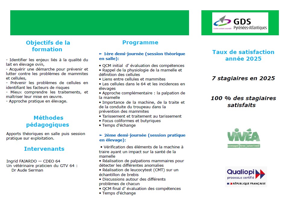 Le GTV 64/40, en partenariat avec le CDEO , organise une session de formation ayant pour objectif de mieux maîtriser le taux cellulaire de leur élevage , celui-ci étant le reflet de la santé des mamelles de leur troupeau , et ce en réponse à des enjeux sanitaires ( santé des brebis avec des risques de mammites ) et des enjeux économiques ( perte de production et pénalités sur le prix de vente du lait )